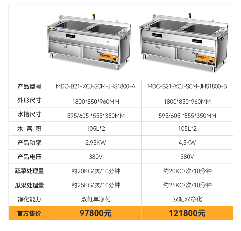 麥大廚1.8米自動商用洗菜機去農藥殘留雙缸水觸媒雙凈化機
